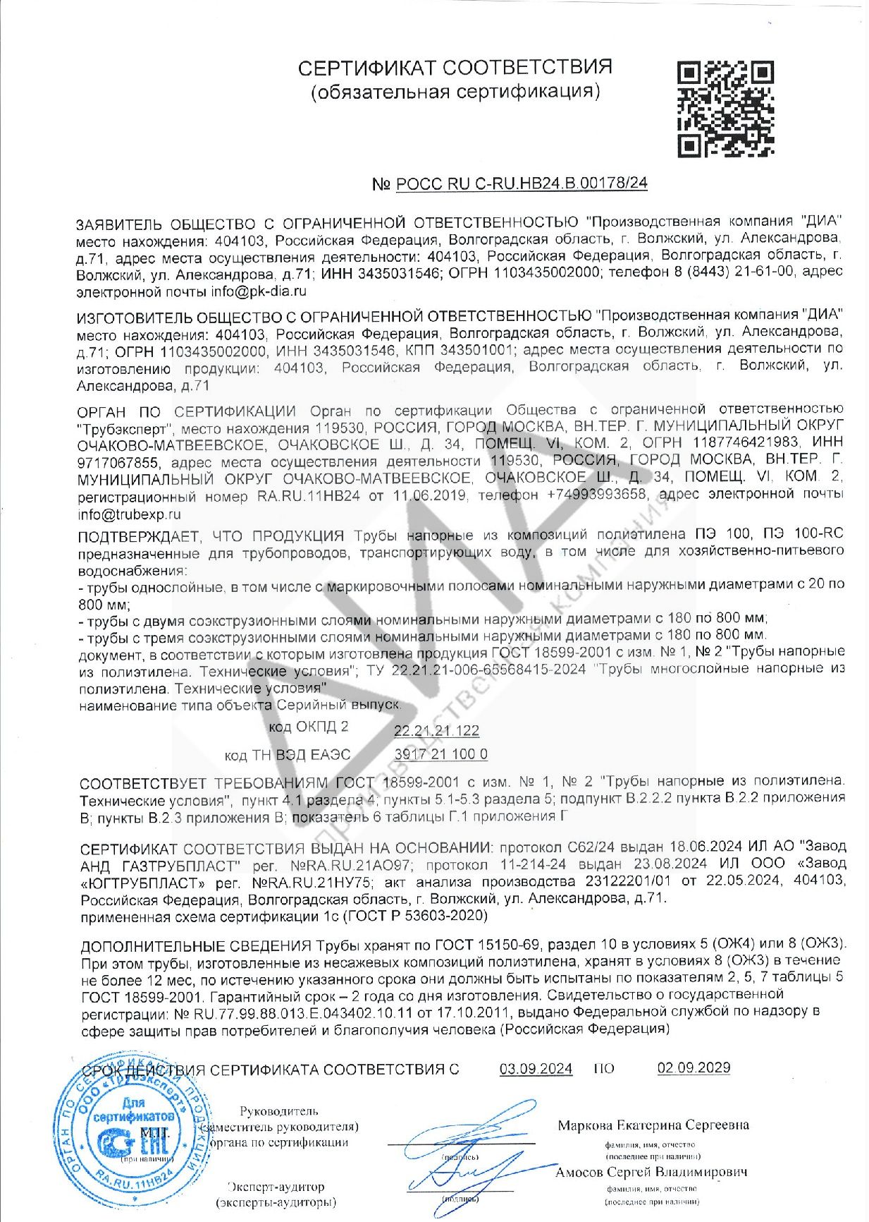Сертификат соответствия (обязательной сертификации) на Трубы из полиэтилена однослойные (ПЭ100) для транспортирования газообразного топлива, номинальными наружными диаметрами от 20 мм по 630 мм (SDR 9, SDR11, SDR 13,6, SDR17, SDR 17,6) соответствует требованиям ГОСТ Р 58121.2-2018 (ИСО 4437-2:2014) "Пластмассовые трубопроводы для транспортирования газообразного топлива. Полиэтилен (ПЭ). Часть 2. Трубы". Серийный выпуск.